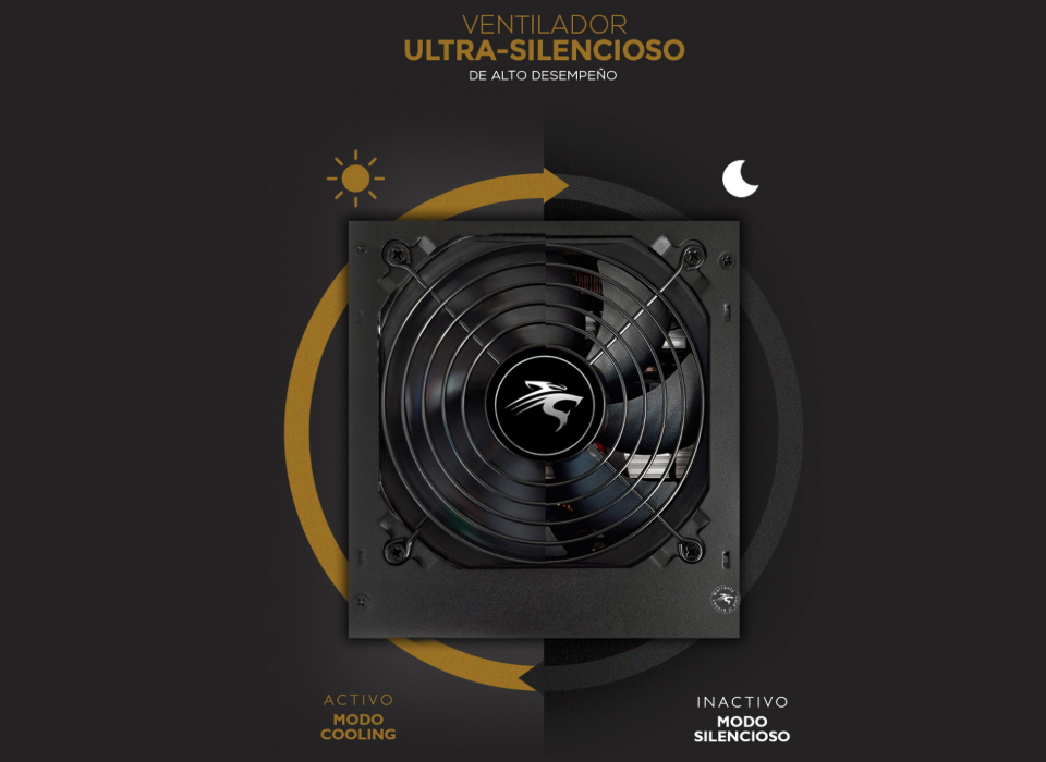 El diseño de Fan Cooler con control inteligente permite disminuir considerablente el ruido durante el funcionamiento normal de la fuente como lo muestra el diagrama.