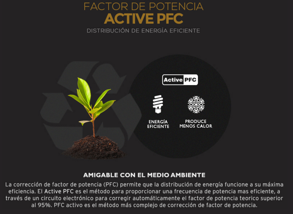 INGREEl PFC activo pueden lograr un factor de potencia de 0,99. Un factor de potencia más alta reduce las pérdidas de transmisión y mejora la eficiencia de las compañías eléctricas, haciendo PFC activo una característica importante para el medio ambiente.