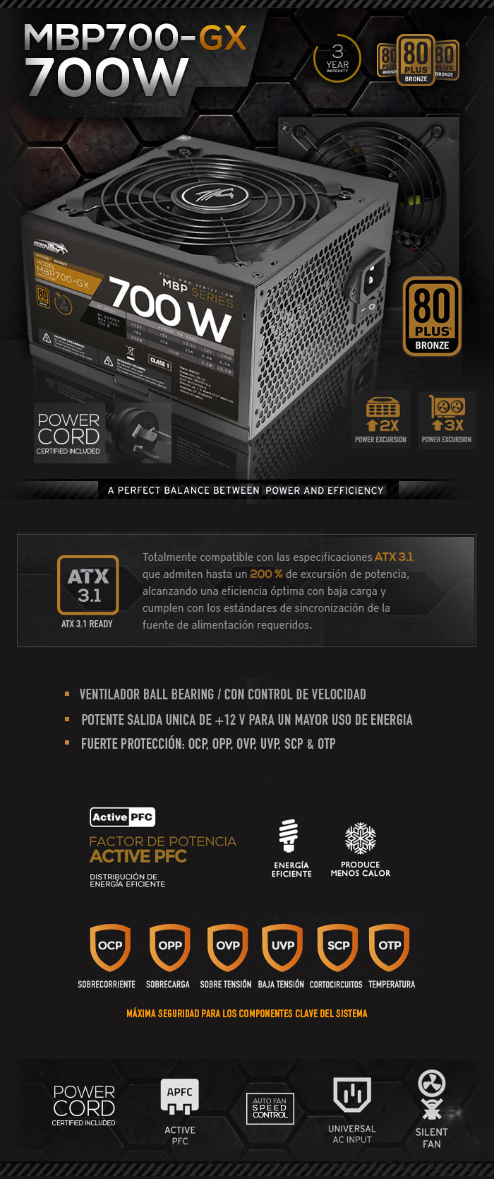 La nueva serie Metal Blade Power con una eficiencia de hasta un 87%, cumple con la Certificacion 80 PLUS Bronze debido a la alta eficiencia de la serie MBP, puede reducir los costos de consumo eléctrico y brindar al mismo tiempo un alto rendimiento.