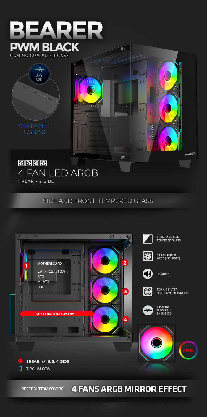 GABINETE BEARER PWM BLACK ATX ARGB 4 FANES / GLASS