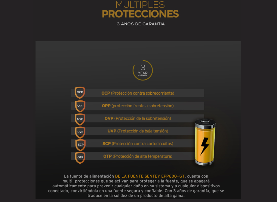 La serie Extreme Power Plus cuentan con multi-protecciones de sobre voltaje, protección de bajo voltaje, protección de sobre potencia y protección contra corto circuito que se activan para proteger a la fuente, que se apagará automáticamente para prevenir cualquier daño en su sistema y a cualquier dispositivos conectado, convirtiéndola en una fuente segura y confiable. Con 3 años de garantía, que se traduce en la solides de un producto de alta gama.