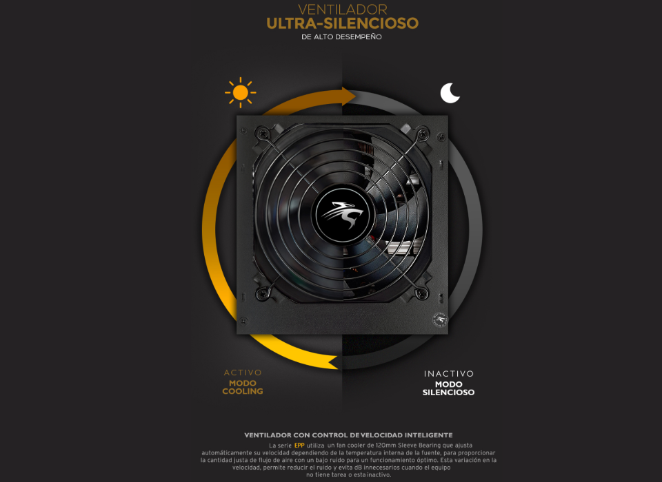 La serie Extreme Power Plus utiliza un fan de 120mm Dual Ball Bearing ajusta automáticamente la velocidad para ofrecer la cantidad adecuada de circulación de aire. Lo que permite obtener menor ruido y evitar generar mayor dB en forma innecesaria