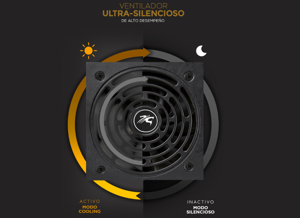 El diseño de Fan Cooler con control inteligente permite disminuir considerablente el ruido durante el funcionamiento normal de la fuente como lo muestra el diagrama.