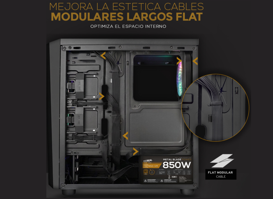 La serie Metal Blade Power cuenta con un único Raíl rubusto y dedicado de +12 V permite con una sencilla configuración disponer de toda la corriente disponible en esa línea, ofreciendo una mayor compatibilidad con los componentes y las tarjetas gráficas de ultima generación.