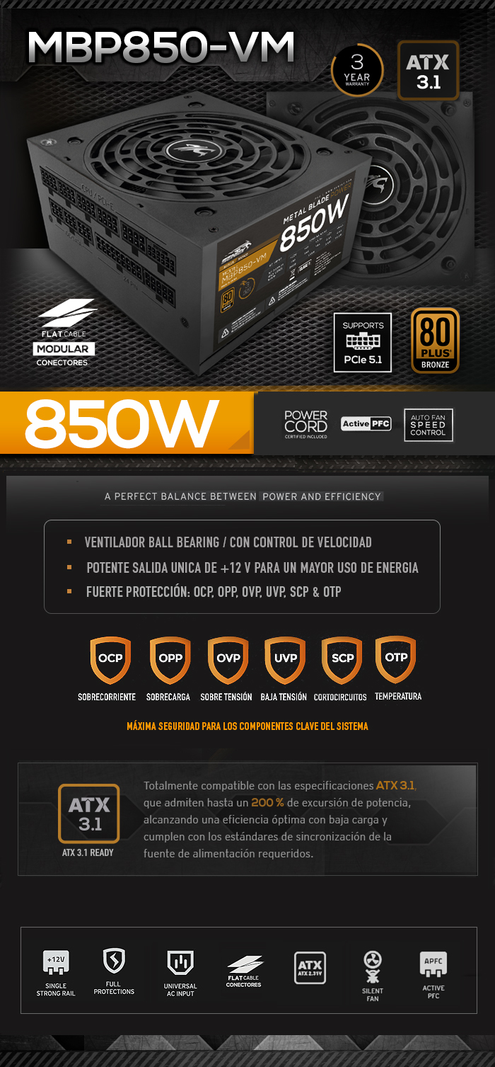 La serie Metal Blade Power cuentan con multi-protecciones de sobre voltaje, protección de bajo voltaje, protección de sobre potencia y protección contra corto circuito que se activan para proteger a la fuente, que se apagará automáticamente para prevenir cualquier daño en su sistema y a cualquier dispositivos conectado, convirtiéndola en una fuente segura y confiable. Con 3 años de garantía, que se traduce en la solides de un producto de alta gama.