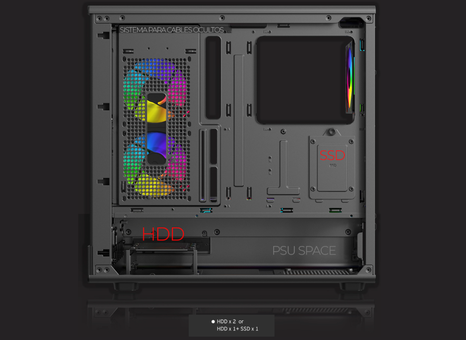 ✅ En la cámara secundaria se ubican la fuente de poder (PSU), los discos duros y los cables.