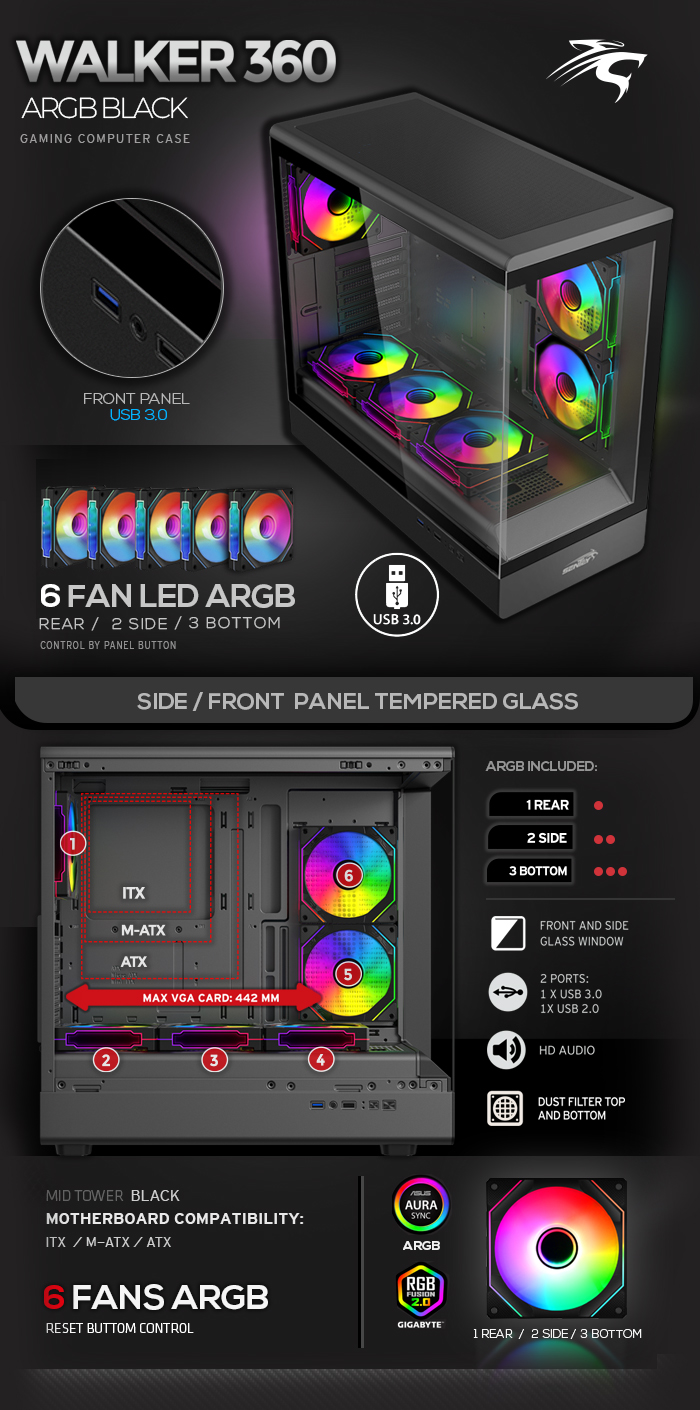 ✅ GABINETE WALKER 360 BLACK ATX ARGB 6 FANES / GLASS